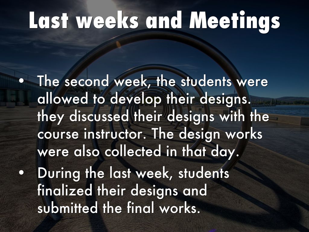 • The second week, the students were allowed to develop their designs. they discussed their designs with the course instructor. The design works were also collected in that day.