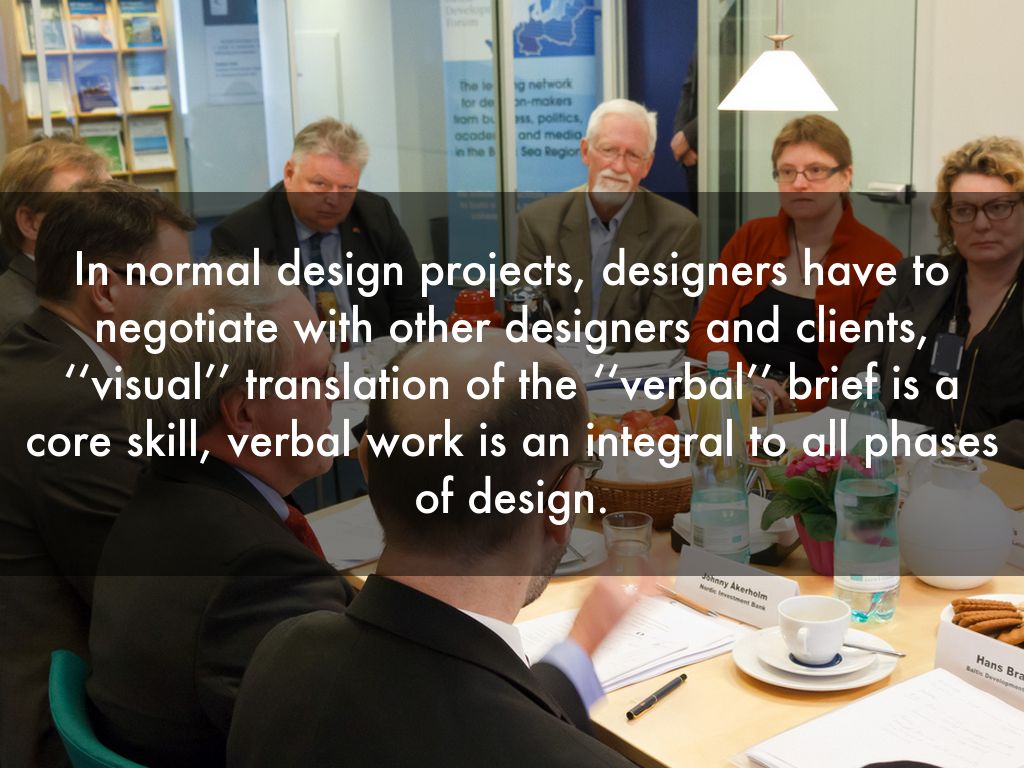 negotiate with other designers and clients, ‘‘visual’’ translation of the ‘‘verbal’’ brief is a core skill, verbal work is an integral to all phases of design.