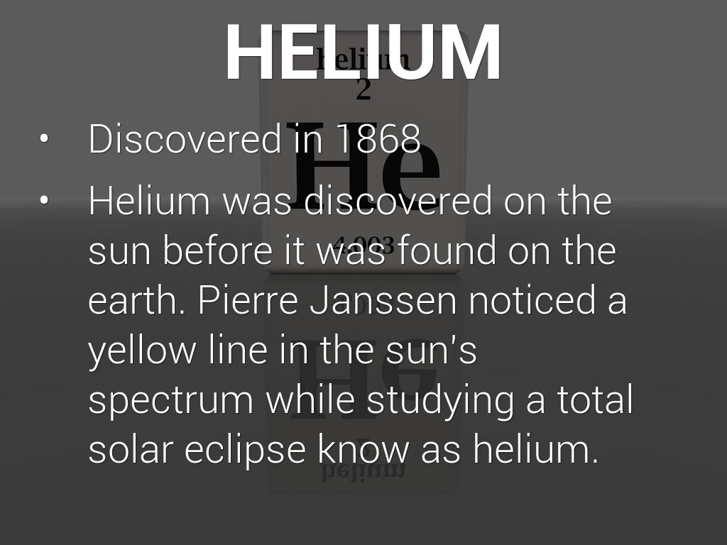 Helium was discovered on the sun before it was found on the earth. Pierre Janssen noticed a yellow line in the sun's spectrum while studying a total solar eclipse know as helium.