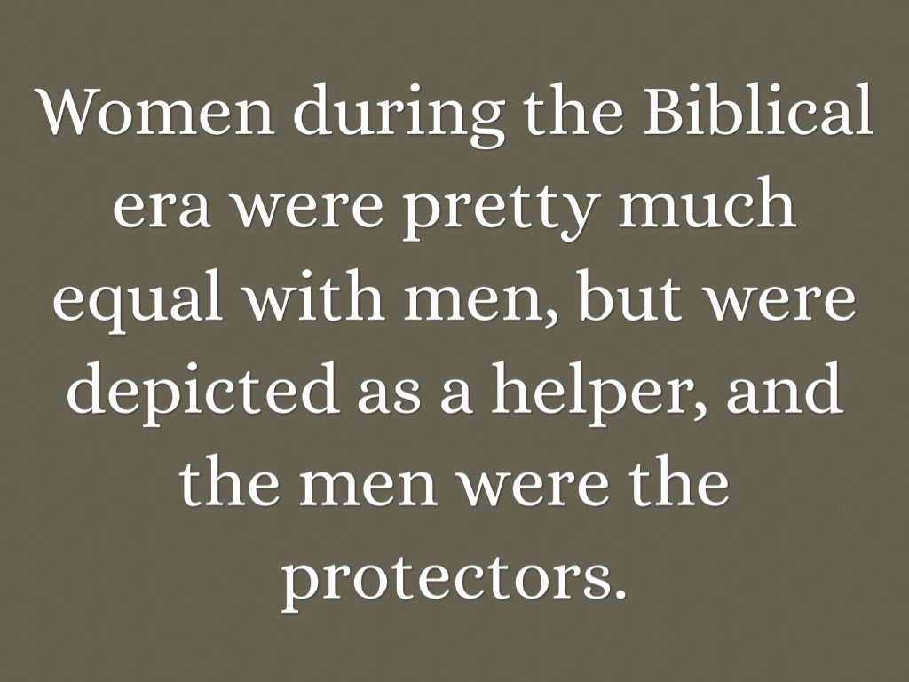 Women during the Biblical era were pretty much equal with men, but were depicted as a helper, and the men were the protectors.