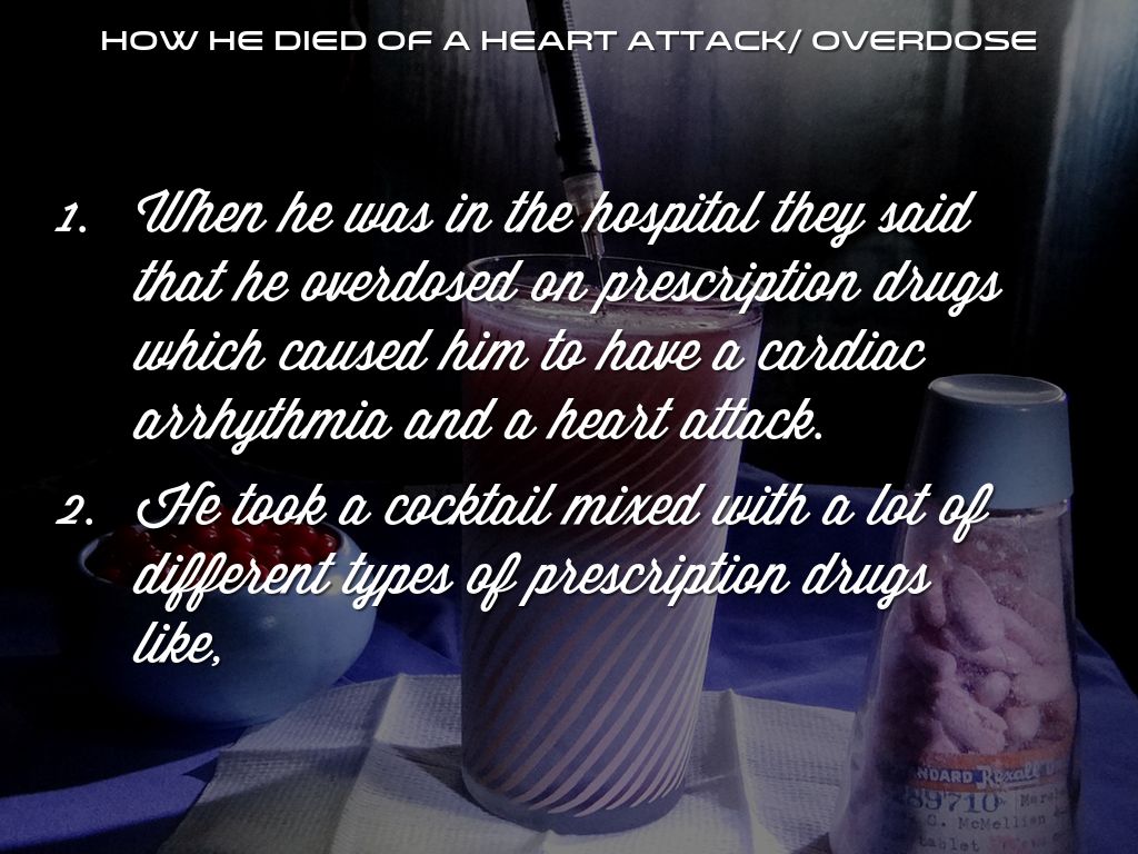 When he was in the hospital they said that he overdosed on prescription drugs which caused him to have a cardiac arrhythmia and a heart attack.