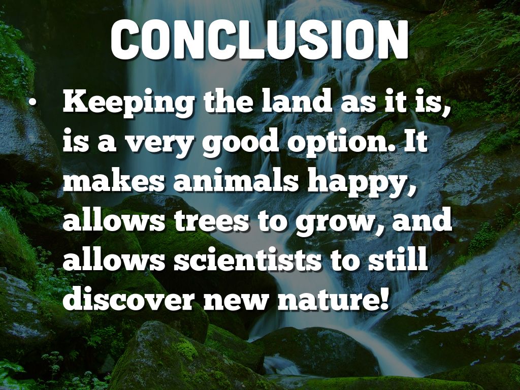 Keeping the land as it is, is a very good option. It makes animals happy, allows trees to grow, and allows scientists to still discover new nature!
