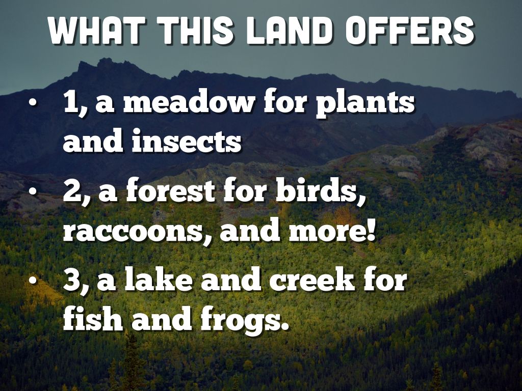 Land isn't just a meadow , it's a home to many creatures that we shouldn't kick out of their homes. How would you like it if you were forced to leave your home?