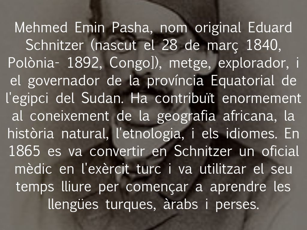 Mehmed Emin Pasha, nom original Eduard Schnitzer (nascut el 28 de març 1840, Polònia- 1892, Congo]), metge, explorador, i el governador de la província Equatorial de l'egipci del Sudan. Ha contribuït enormement al coneixement de la geografia africana, la història natural, l'etnologia, i els idiomes. En 1865 es va convertir en Schnitzer un oficial mèdic en l'exèrcit turc i va utilitzar el seu temps lliure per començar a aprendre les llengües turques, àrabs i perses.