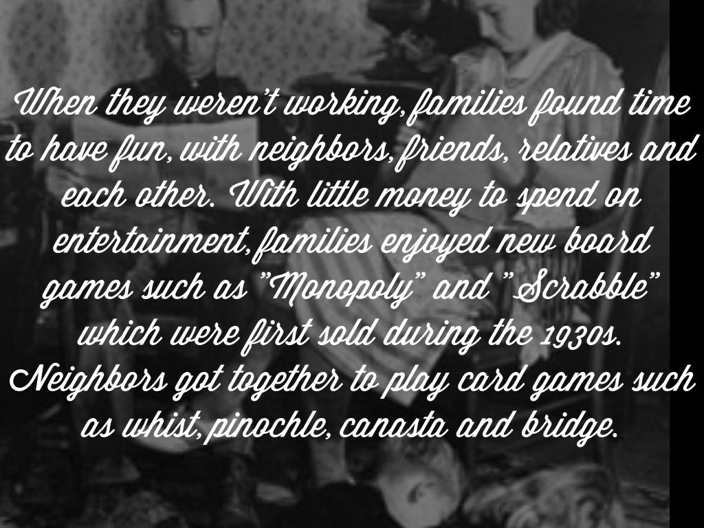 When they weren't working, families found time to have fun, with neighbors, friends, relatives and each other. With little money to spend on entertainment, families enjoyed new board games such as "Monopoly" and "Scrabble" which were first sold during the 1930s. Neighbors got together to play card games such as whist, pinochle, canasta and bridge.