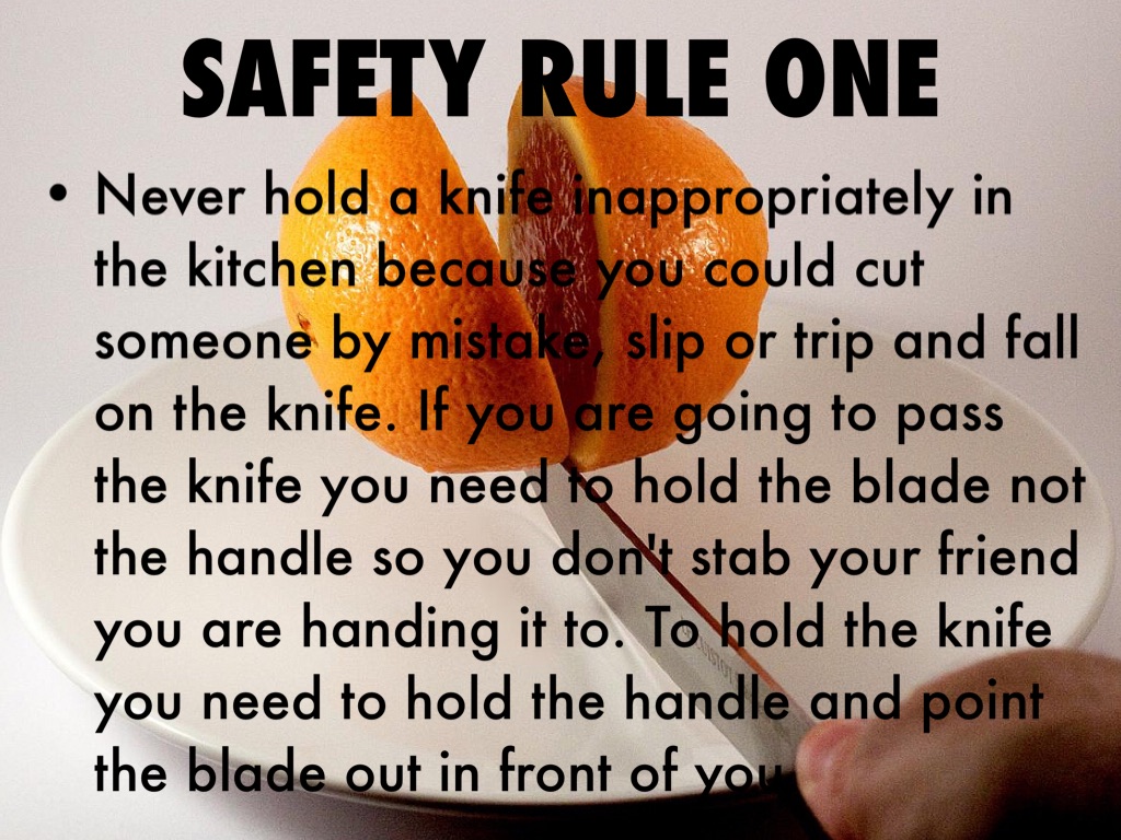 Never hold a knife inappropriately in the kitchen because you could cut someone by mistake, slip or trip and fall on the knife. If you are going to pass the knife you need to hold the blade not the handle so you don't stab your friend you are handing it to. To hold the knife you need to hold the handle and point the blade out in front of you.