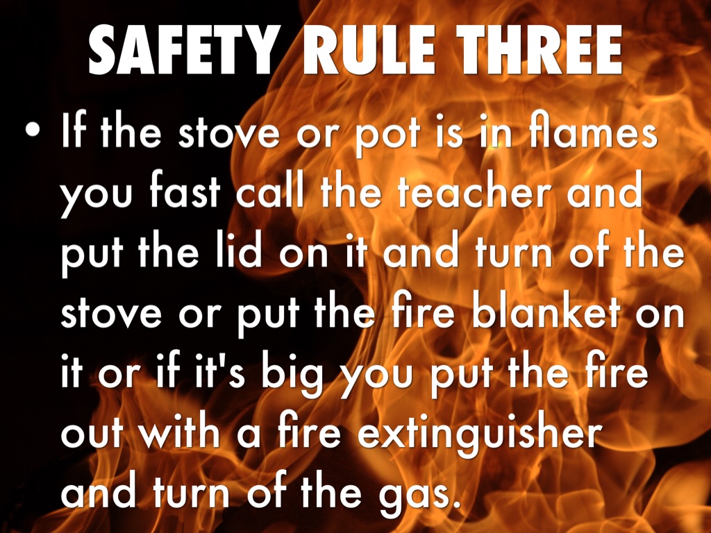 If the stove or pot is in flames you fast call the teacher and put the lid on it and turn of the stove or put the fire blanket on it or if it's big you put the fire out with a fire extinguisher and turn of the gas.
