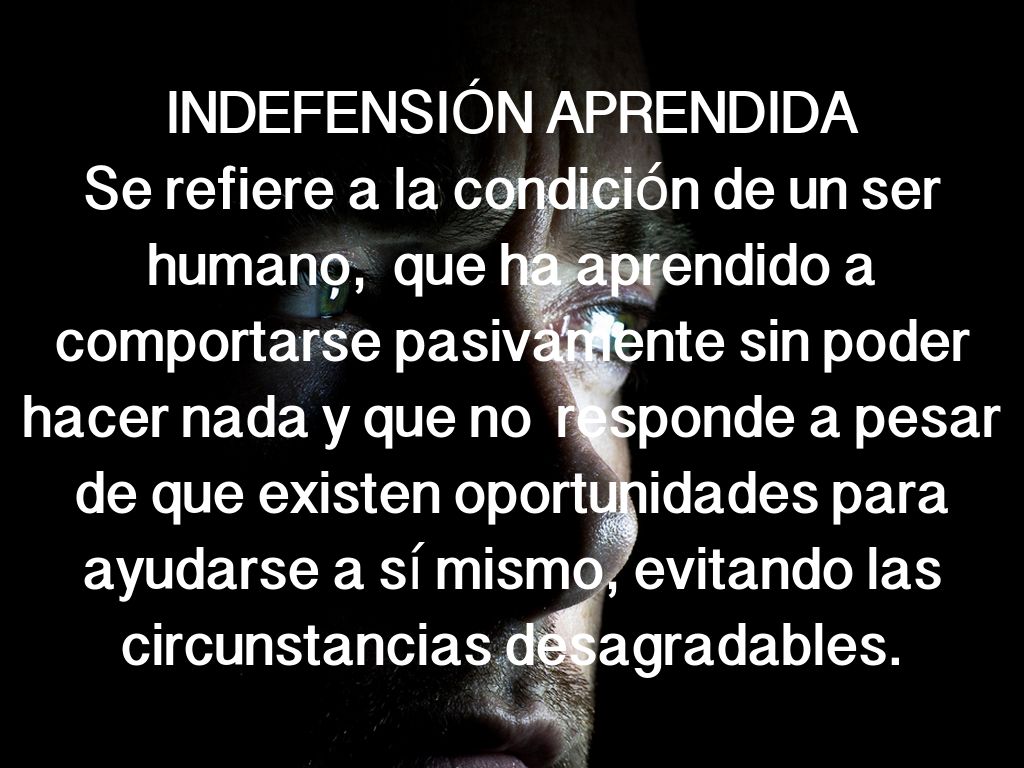 INDEFENSIÓN APRENDIDA Se refiere a la condición de un ser humano, que ha aprendido a comportarse pasivamente sin poder hacer nada y que no responde a pesar de que existen oportunidades para ayudarse a sí mismo, evitando las circunstancias desagradables.