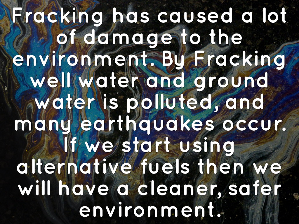 Fracking has caused a lot of damage to the environment. By Fracking well water and ground water is polluted, and many earthquakes occur. If we start using alternative fuels then we will have a cleaner, safer environment.