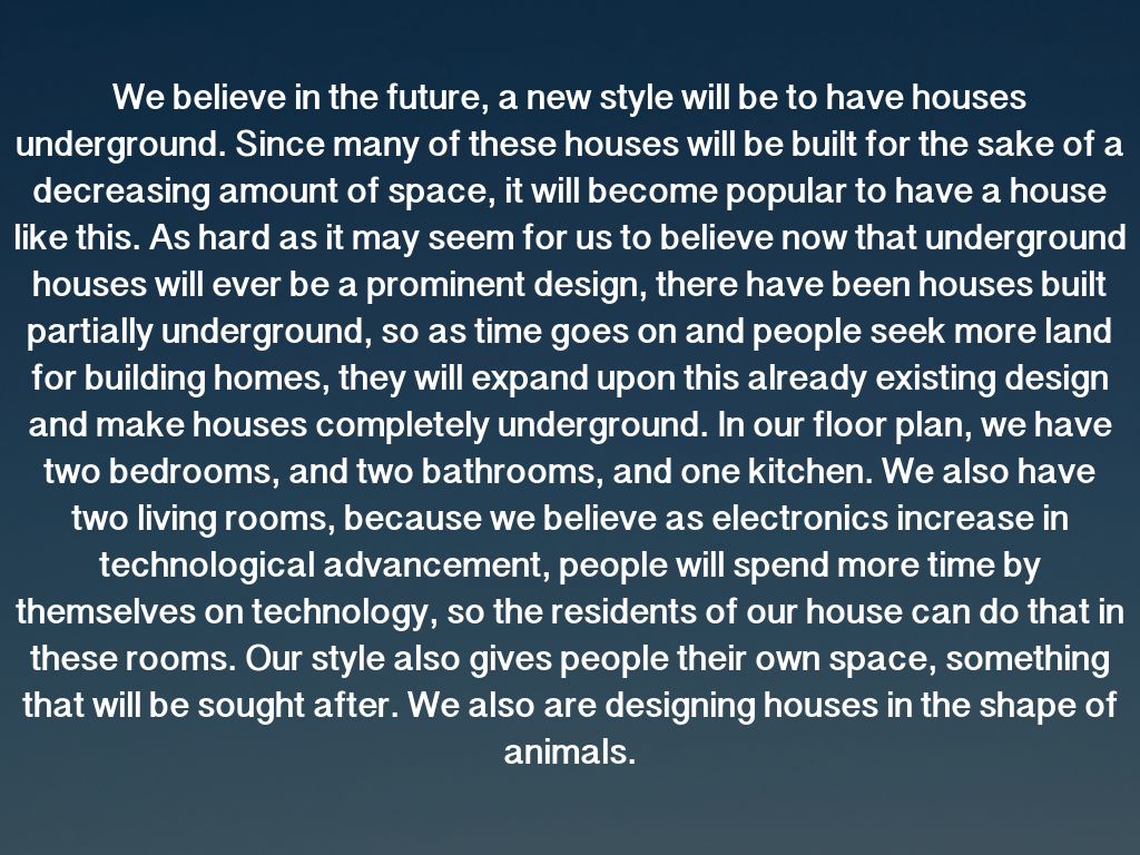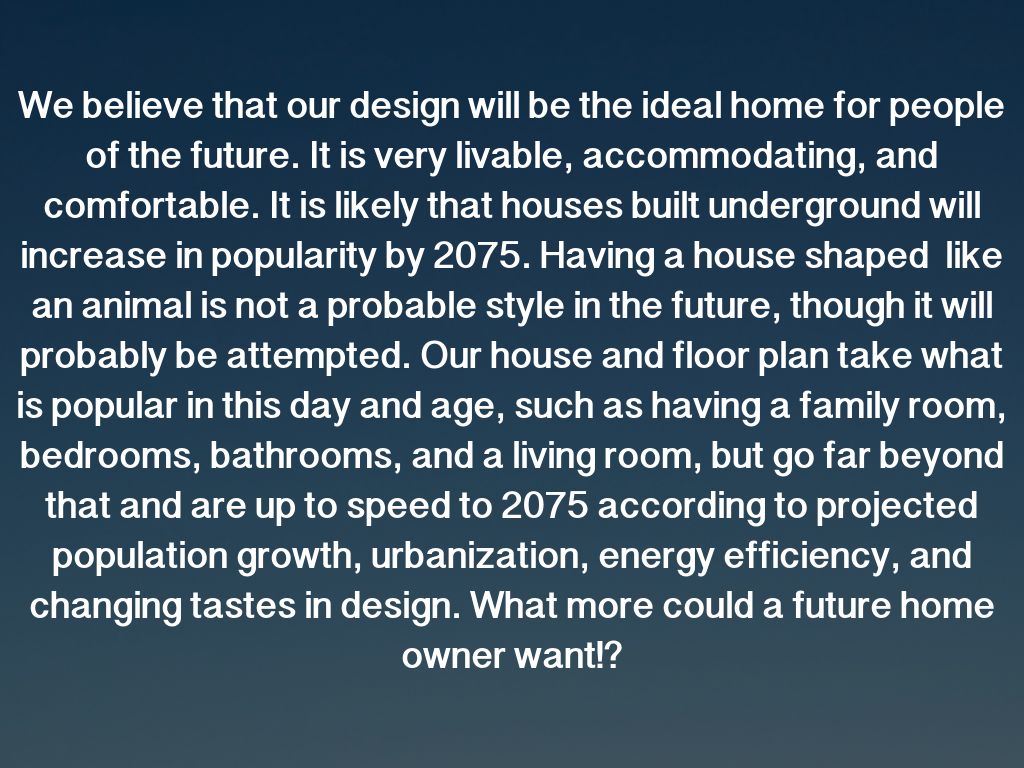 We believe that our design will be the ideal home for people of the future. It is very livable, accommodating, and comfortable. It is likely that houses built underground will increase in popularity by 2075. Having a house shaped like an animal is not a probable style in the future, though it will probably be attempted. Our house and floor plan take what is popular in this day and age, such as having a family room, bedrooms, bathrooms, and a living room, but go far beyond that and are up to speed to 2075 according to projected population growth, urbanization, energy efficiency, and changing tastes in design. What more could a future home owner want!?