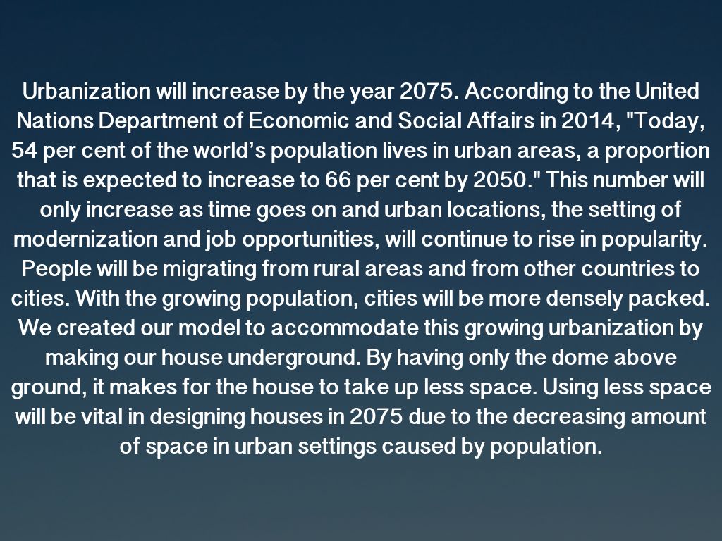 Urbanization will increase by the year 2075. According to the United Nations Department of Economic and Social Affairs in 2014, "Today, 54 per cent of the world’s population lives in urban areas, a proportion that is expected to increase to 66 per cent by 2050." This number will only increase as time goes on and urban locations, the setting of modernization and job opportunities, will continue to rise in popularity. People will be migrating from rural areas and from other countries to cities. With the growing population, cities will be more densely packed. We created our model to accommodate this growing urbanization by making our house underground. By having only the dome above ground, it makes for the house to take up less space. Using less space will be vital in designing houses in 2075 due to the decreasing amount of space in urban settings caused by population.