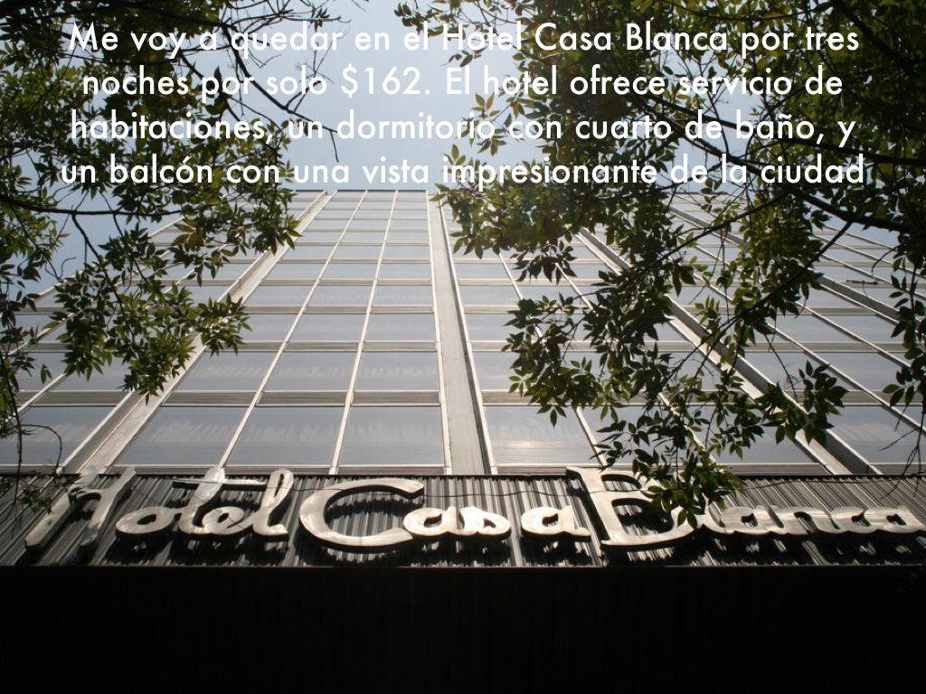 Me voy a quedar en el Hotel Casa Blanca por tres noches por solo $162. El hotel ofrece servicio de habitaciones, un dormitorio con cuarto de ba帽o, y un balc贸n con una vista impresionante de la ciudad
