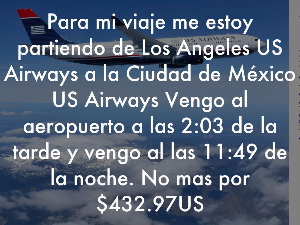 Para mi viaje me estoy partiendo de Los Angeles US Airways a la Ciudad de M茅xico US Airways Vengo al aeropuerto a las 2:03 de la tarde y vengo al las 11:49 de la noche. No mas por $432.97US