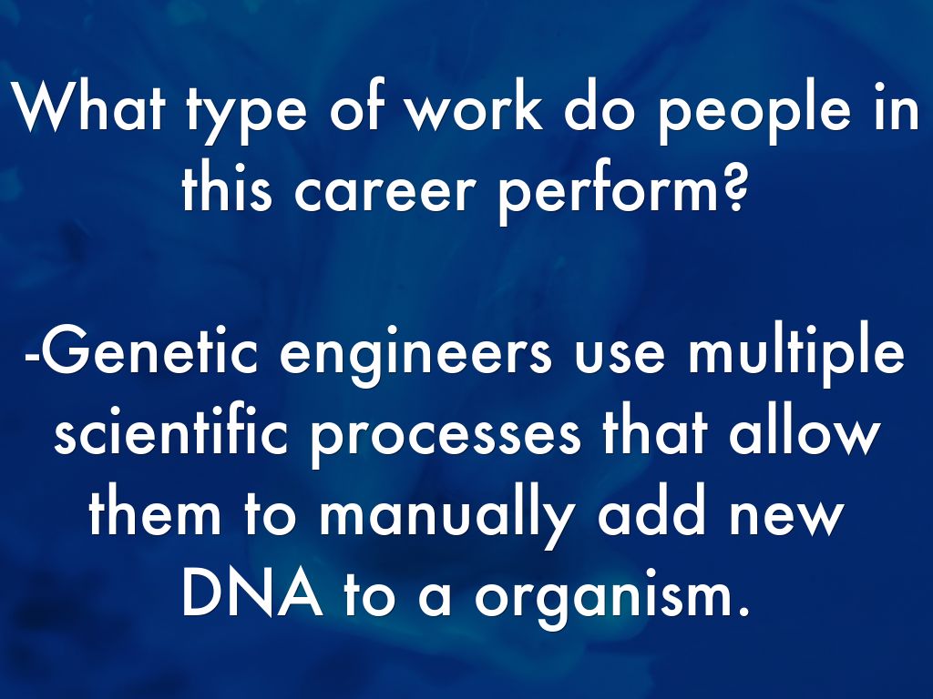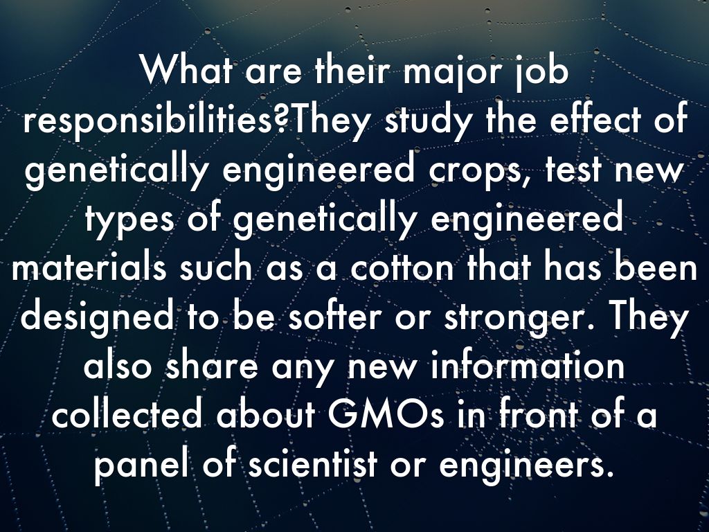 What are their major job responsibilities?They study the effect of genetically engineered crops, test new types of genetically engineered materials such as a cotton that has been designed to be softer or stronger. They also share any new information collected about GMOs in front of a panel of scientist or engineers.
