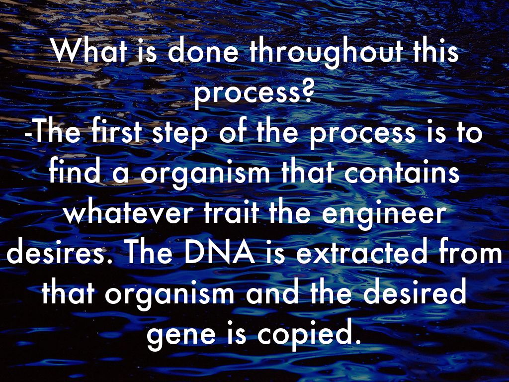 What is done throughout this process? -The first step of the process is to find a organism that contains whatever trait the engineer desires. The DNA is extracted from that organism and the desired gene is copied.