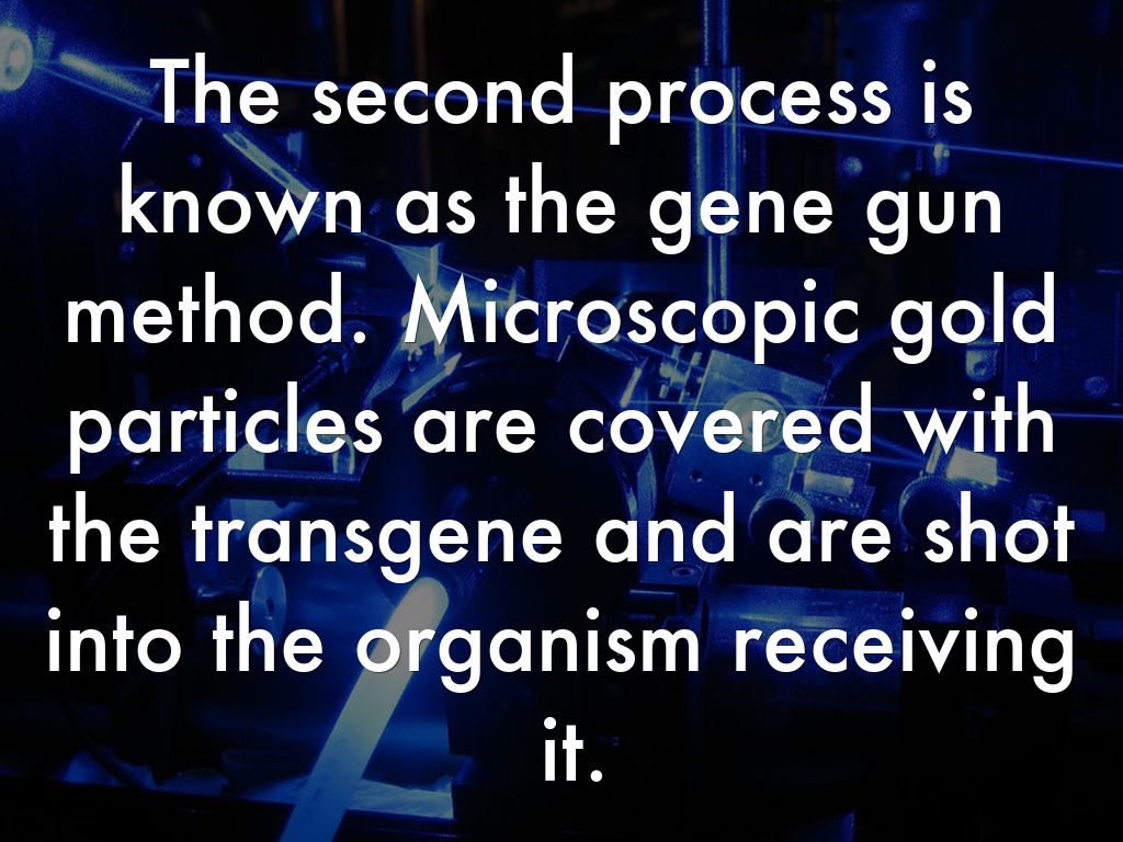 The second process is known as the gene gun method. Microscopic gold particles are covered with the transgene and are shot into the organism receiving it.