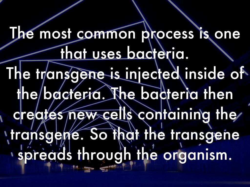 The most common process is one that uses bacteria. The transgene is injected inside of the bacteria. The bacteria then creates new cells containing the transgene. So that the transgene spreads through the organism.