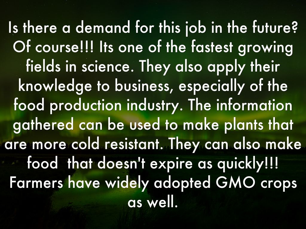 Is there a demand for this job in the future? Of course!!! Its one of the fastest growing fields in science. They also apply their knowledge to business, especially of the food production industry. The information gathered can be used to make plants that are more cold resistant. They can also make food that doesn't expire as quickly!!! Farmers have widely adopted GMO crops as well.