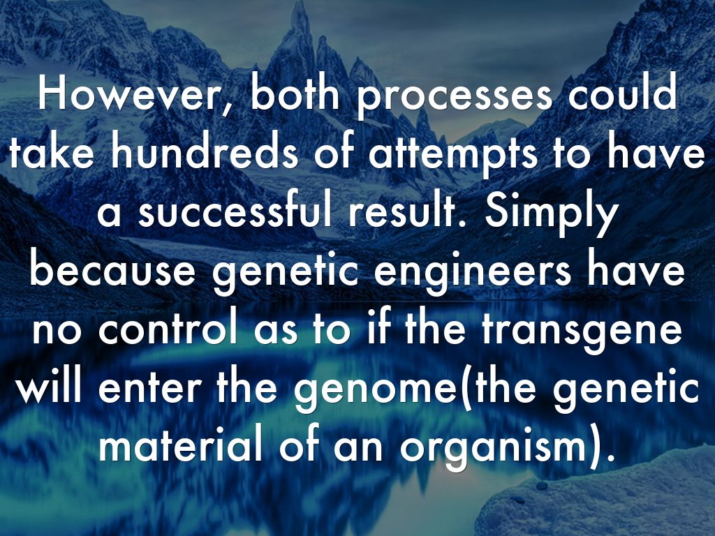 However, both processes could take hundreds of attempts to have a successful result. Simply because genetic engineers have no control as to if the transgene will enter the genome(the genetic material of an organism).