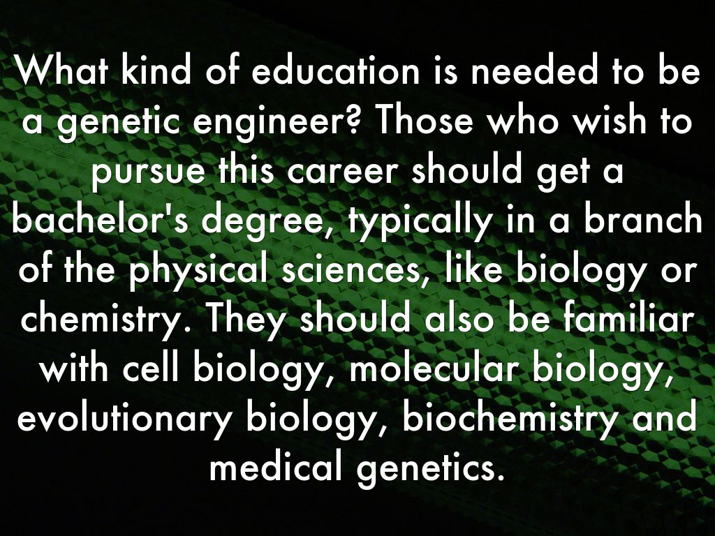 What kind of education is needed to be a genetic engineer? Those who wish to pursue this career should get a bachelor's degree, typically in a branch of the physical sciences, like biology or chemistry. They should also be familiar with cell biology, molecular biology, evolutionary biology, biochemistry and medical genetics.