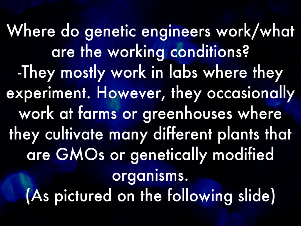 Where do genetic engineers work/what are the working conditions? -They mostly work in labs where they experiment. However, they occasionally work at farms or greenhouses where they cultivate many different plants that are GMOs or genetically modified organisms. (As pictured on the following slide)
