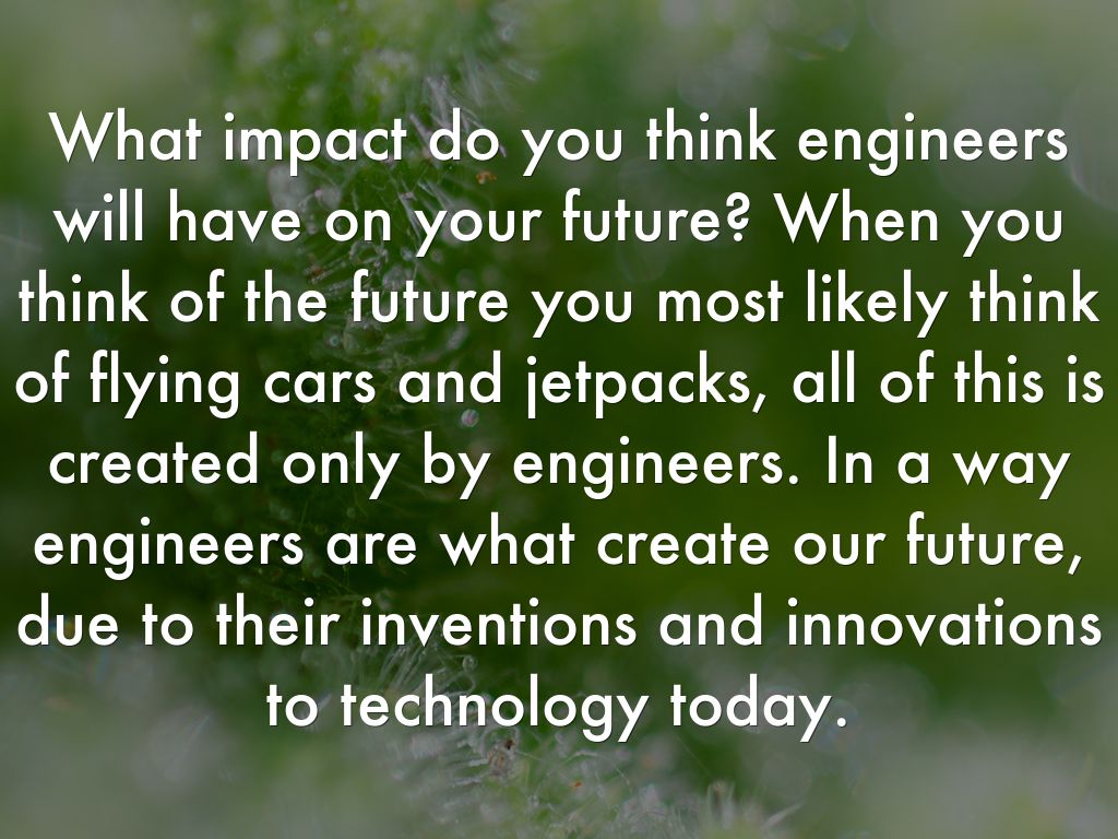 What impact do you think engineers will have on your future? When you think of the future you most likely think of flying cars and jetpacks, all of this is created only by engineers. In a way engineers are what create our future, due to their inventions and innovations to technology today.