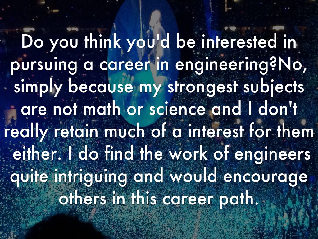Do you think you'd be interested in pursuing a career in engineering?No, simply because my strongest subjects are not math or science and I don't really retain much of a interest for them either. I do find the work of engineers quite intriguing and would encourage others in this career path.