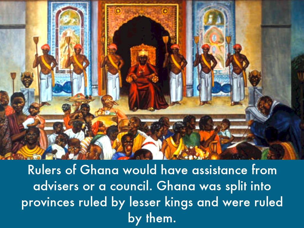 Rulers of Ghana would have assistance from advisers or a council. Ghana was split into provinces ruled by lesser kings and were ruled by them.