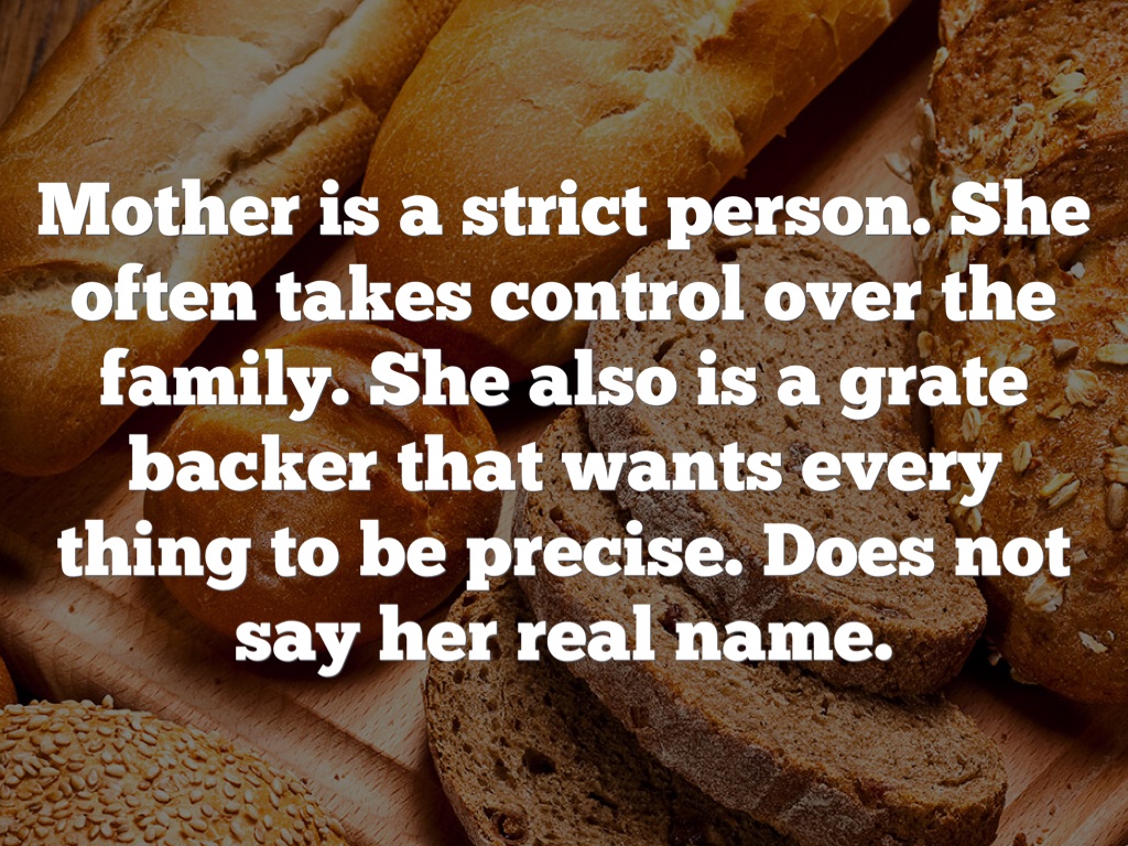 Mother is a strict person. She often takes control over the family. She also is a grate backer that wants every thing to be precise. Does not say her real name.