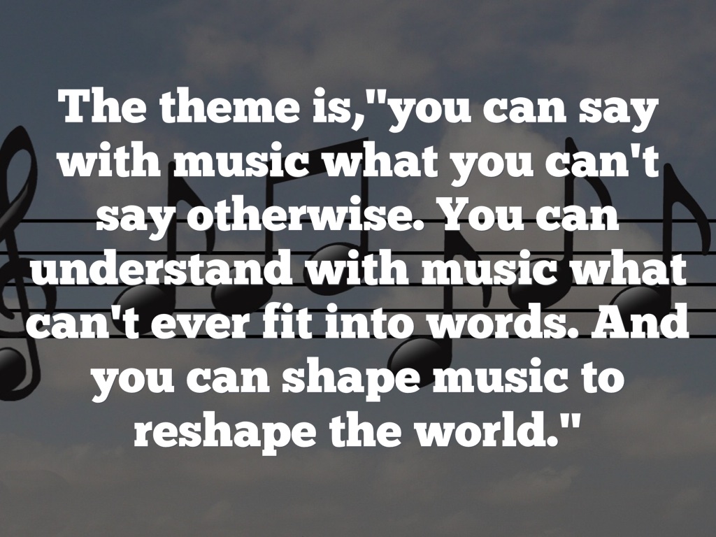 The theme is,"you can say with music what you can't say otherwise. You can understand with music what can't ever fit into words. And you can shape music to reshape the world."
