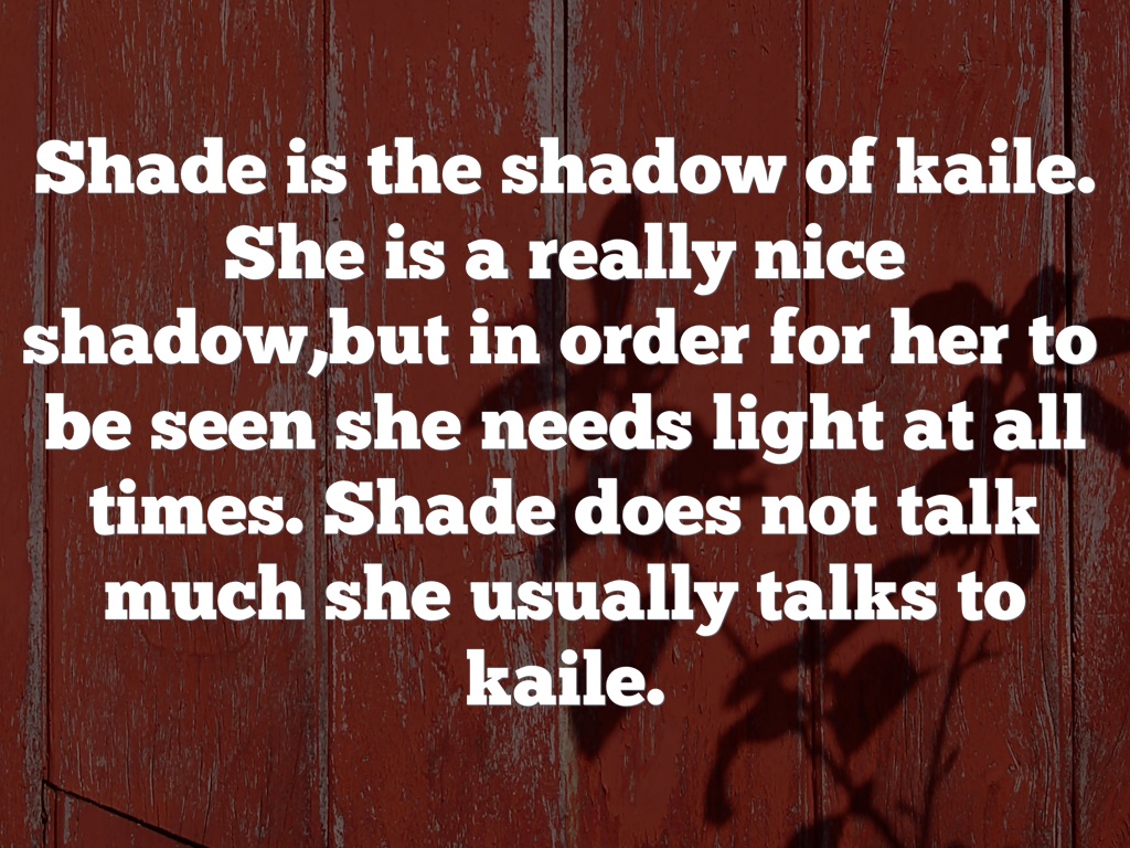 Shade is the shadow of kaile. She is a really nice shadow,but in order for her to be seen she needs light at all times. Shade does not talk much she usually talks to kaile.