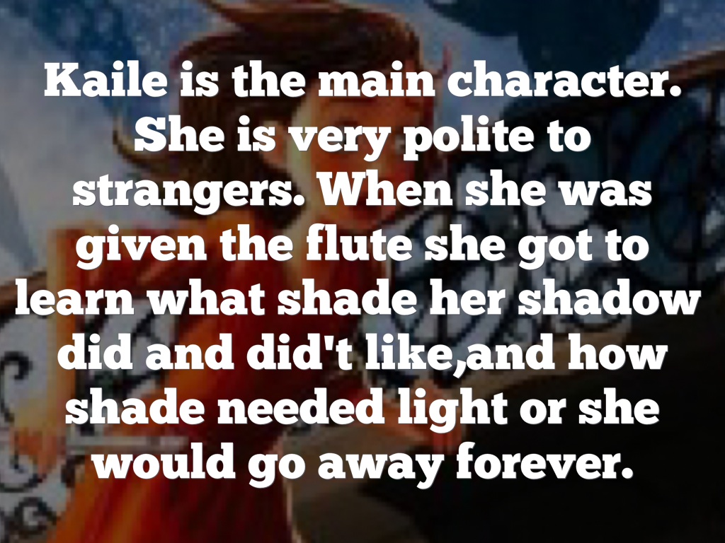 Kaile is the main character. She is very polite to strangers. When she was given the flute she got to learn what shade her shadow did and did't like,and how shade needed light or she would go away forever.