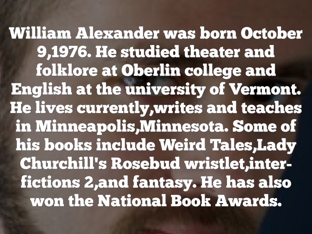 William Alexander was born October 9,1976. He studied theater and folklore at Oberlin college and English at the university of Vermont. He lives currently,writes and teaches in Minneapolis,Minnesota. Some of his books include Weird Tales,Lady Churchill's Rosebud wristlet,inter-fictions 2,and fantasy. He has also won the National Book Awards.