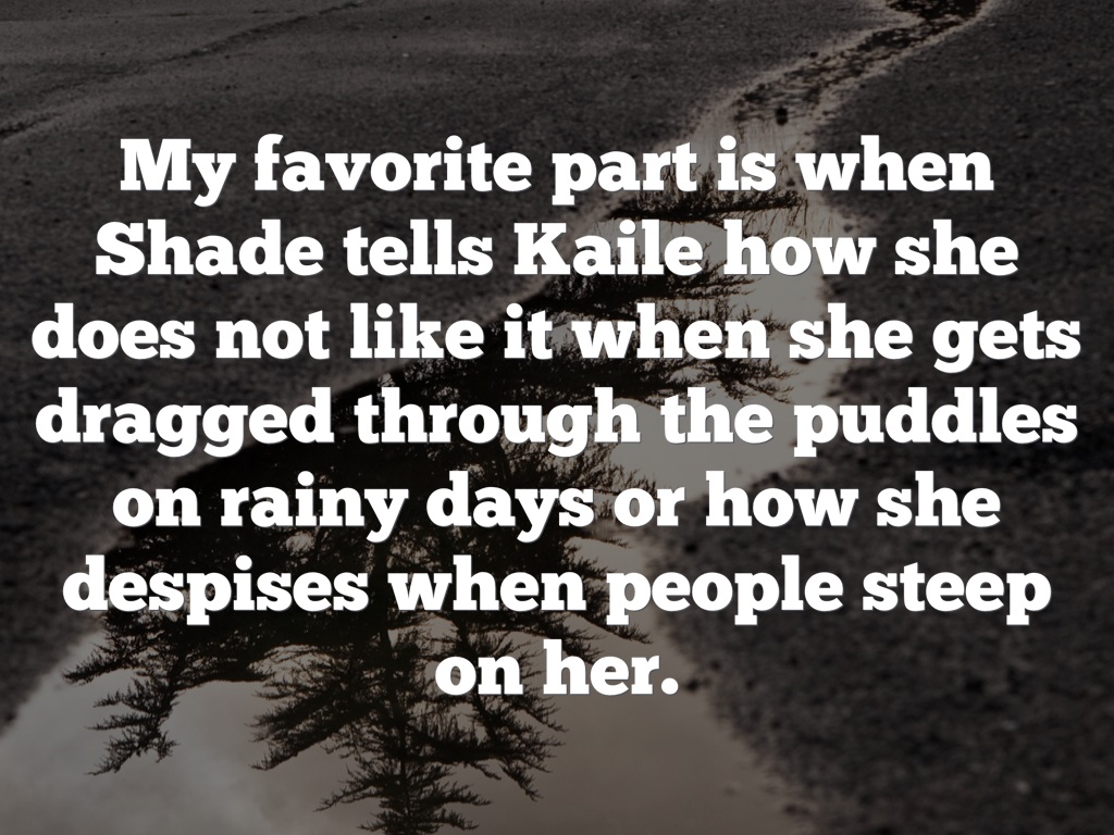My favorite part is when Shade tells Kaile how she does not like it when she gets dragged through the puddles on rainy days or how she despises when people steep on her.