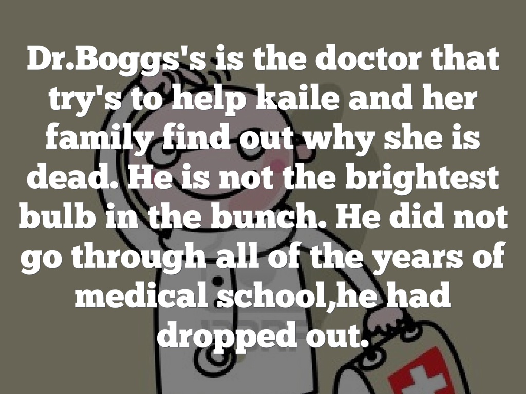 Dr.Boggs's is the doctor that try's to help kaile and her family find out why she is dead. He is not the brightest bulb in the bunch. He did not go through all of the years of medical school,he had dropped out.