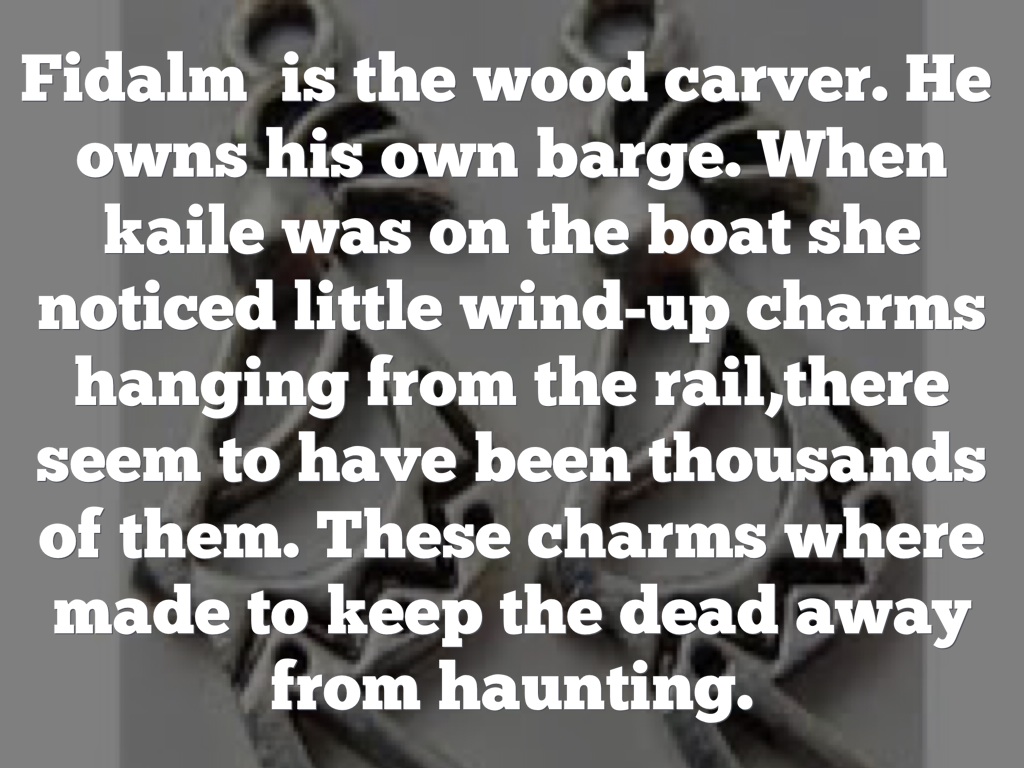 Fidalm is the wood carver. He owns his own barge. When kaile was on the boat she noticed little wind-up charms hanging from the rail,there seem to have been thousands of them. These charms where made to keep the dead away from haunting.