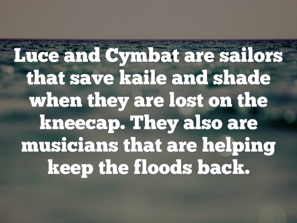 Luce and Cymbat are sailors that save kaile and shade when they are lost on the kneecap. They also are musicians that are helping keep the floods back.