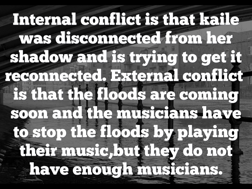 Internal conflict is that kaile was disconnected from her shadow and is trying to get it reconnected. External conflict is that the floods are coming soon and the musicians have to stop the floods by playing their music,but they do not have enough musicians.
