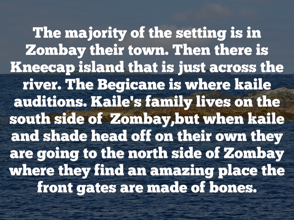 The majority of the setting is in Zombay their town. Then there is Kneecap island that is just across the river. The Begicane is where kaile auditions. Kaile's family lives on the south side of Zombay,but when kaile and shade head off on their own they are going to the north side of Zombay where they find an amazing place the front gates are made of bones.