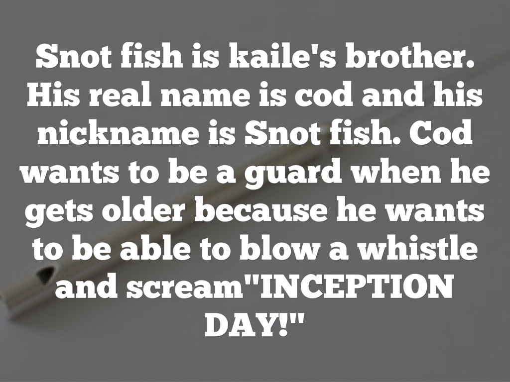 Snot fish is kaile's brother. His real name is cod and his nickname is Snot fish. Cod wants to be a guard when he gets older because he wants to be able to blow a whistle and scream"INCEPTION DAY!"