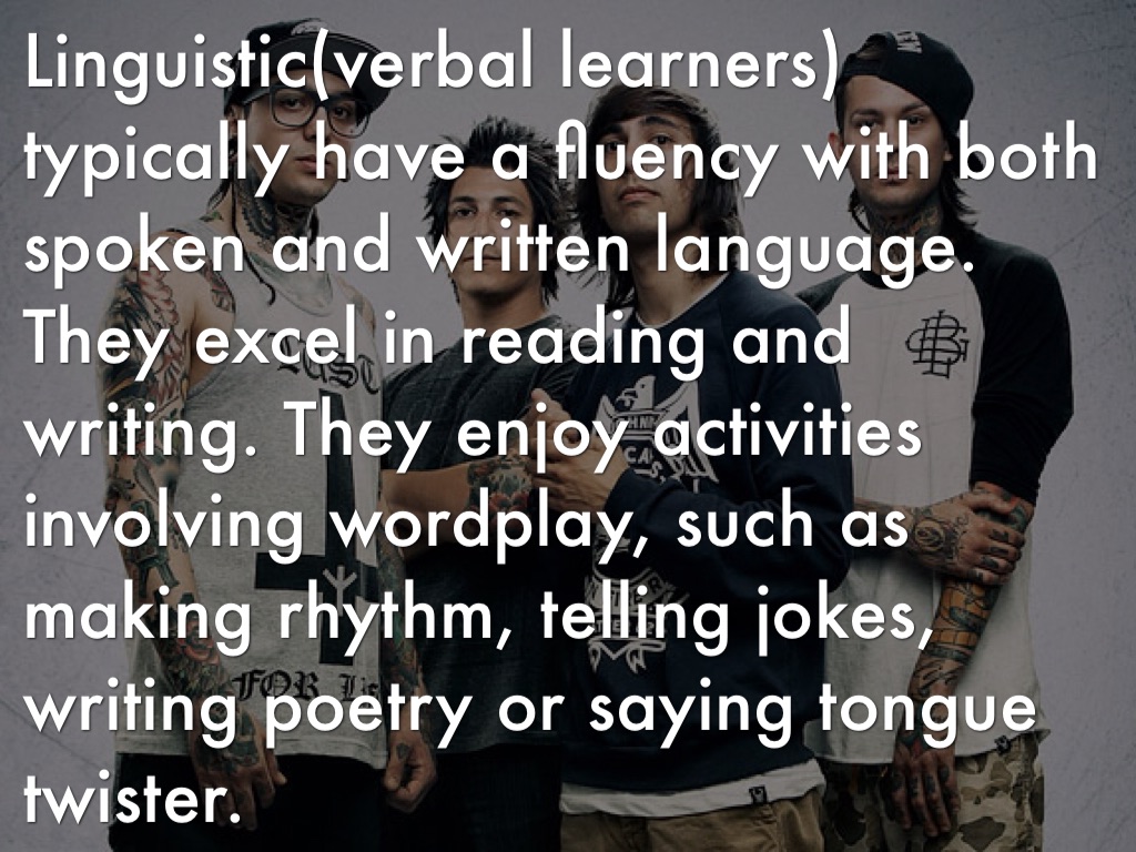 Linguistic(verbal learners) typically have a fluency with both spoken and written language. They excel in reading and writing. They enjoy activities involving wordplay, such as making rhythm, telling jokes, writing poetry or saying tongue twister.