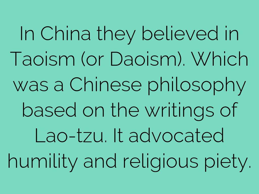 In China they believed in Taoism (or Daoism). Which was a Chinese philosophy based on the writings of Lao-tzu. It advocated humility and religious piety.