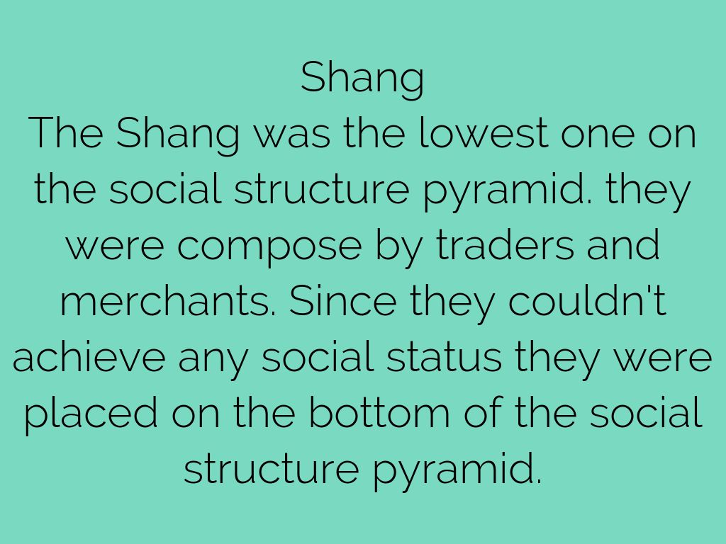 The Shang was the lowest one on the social structure pyramid. they were compose by traders and merchants. Since they couldn't achieve any social status they were placed on the bottom of the social structure pyramid.