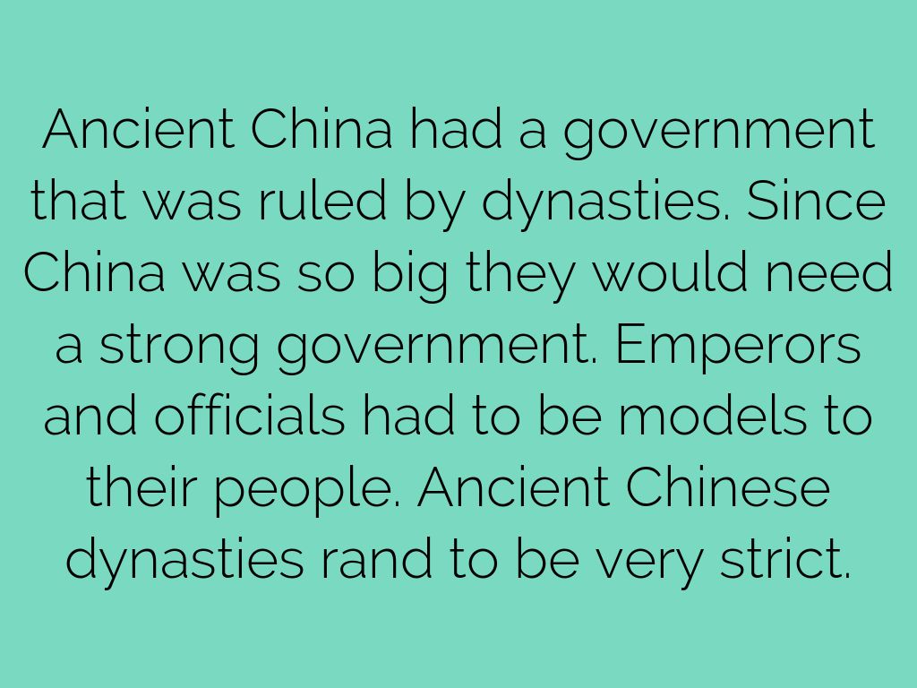 Ancient China had a government that was ruled by dynasties. Since China was so big they would need a strong government. Emperors and officials had to be models to their people. Ancient Chinese dynasties rand to be very strict.
