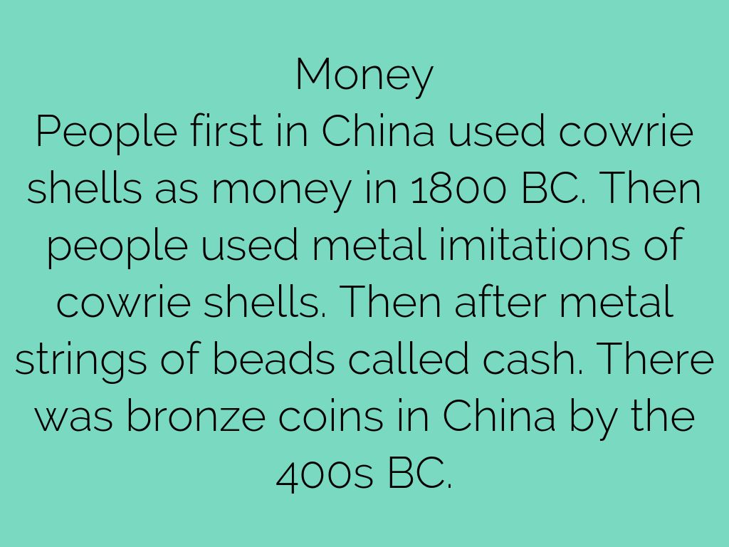 People first in China used cowrie shells as money in 1800 BC. Then people used metal imitations of cowrie shells. Then after metal strings of beads called cash. There was bronze coins in China by the 400s BC.
