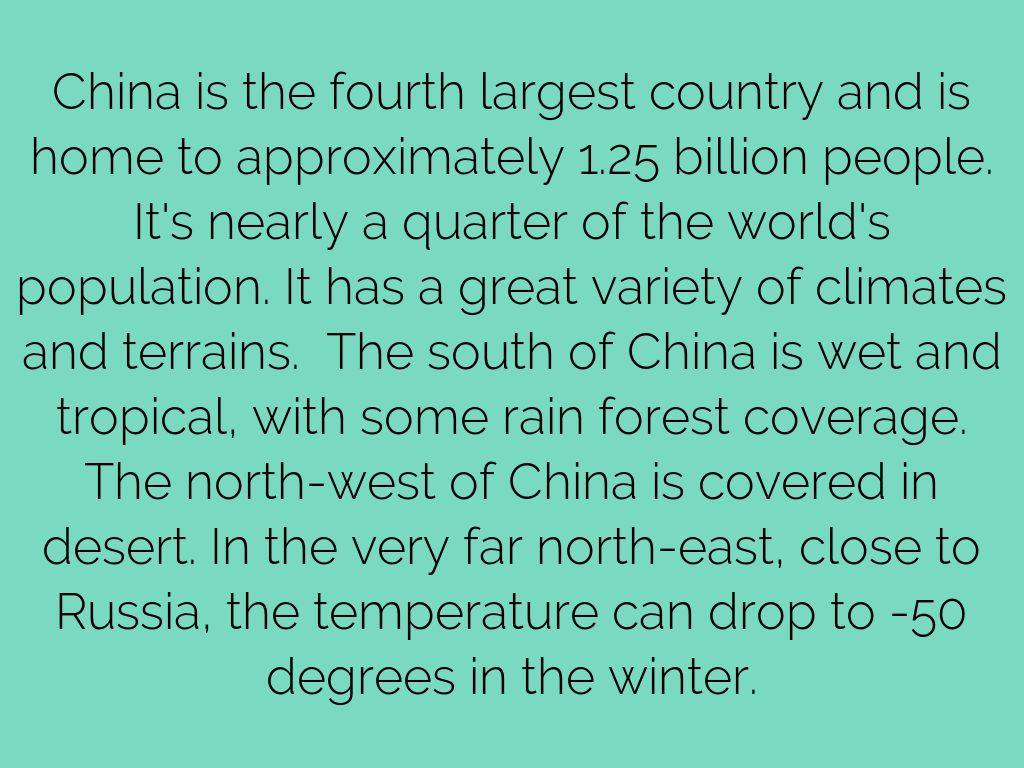 China is the fourth largest country and is home to approximately 1.25 billion people. It's nearly a quarter of the world's population. It has a great variety of climates and terrains. The south of China is wet and tropical, with some rain forest coverage. The north-west of China is covered in desert. In the very far north-east, close to Russia, the temperature can drop to -50 degrees in the winter.