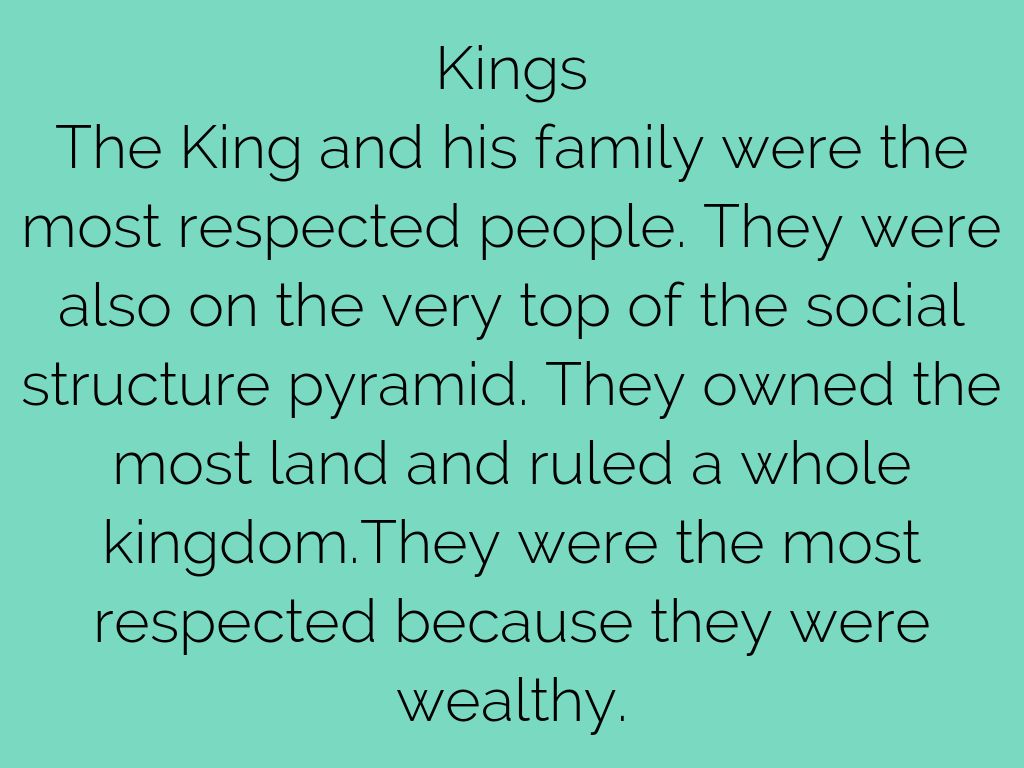 The King and his family were the most respected people. They were also on the very top of the social structure pyramid. They owned the most land and ruled a whole kingdom.They were the most respected because they were wealthy.