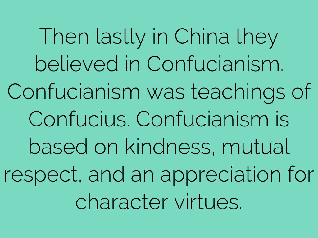 Then lastly in China they believed in Confucianism. Confucianism was teachings of Confucius. Confucianism is based on kindness, mutual respect, and an appreciation for character virtues.