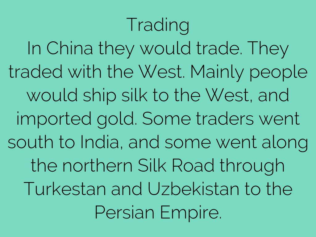 In China they would trade. They traded with the West. Mainly people would ship silk to the West, and imported gold. Some traders went south to India, and some went along the northern Silk Road through Turkestan and Uzbekistan to the Persian Empire.