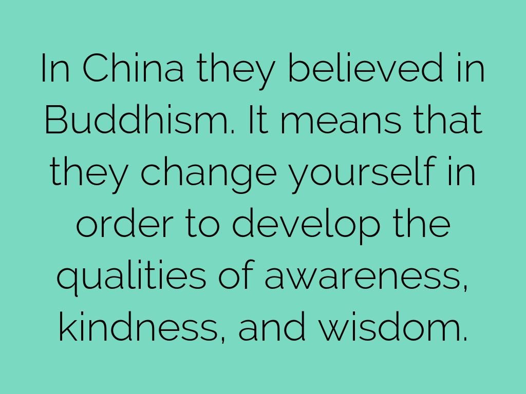 In China they believed in Buddhism. It means that they change yourself in order to develop the qualities of awareness, kindness, and wisdom.